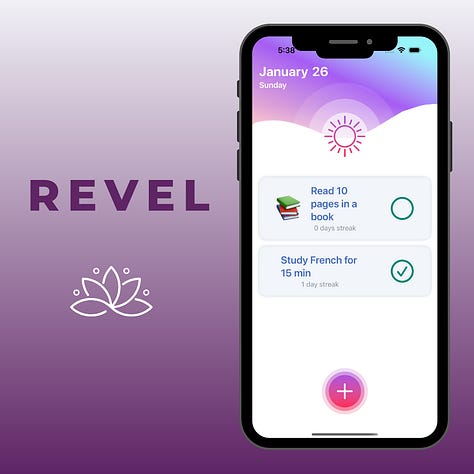 Revel is a habit tracker and I got the idea New Year’s week 2025. Of course it took me a couple of months to build it (this was one of the more difficult apps for some reason). Like Day.ly, Revel keeps you focused on what’s happening today.
